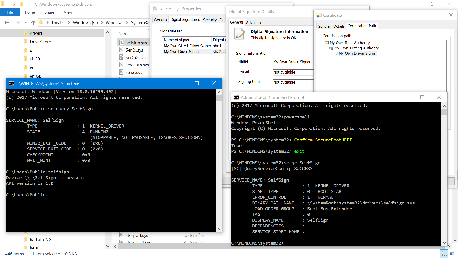 The Command Prompt in the foreground shows first that we really are in Windows 10, specifically in its 1709 release. Next the sc query command confirms that the Service Control Manager knows that a service named SelfSign is in fact a kernel driver and that it’s running. Finally, a selfsign command, written as a companion to the driver, confirms that the driver is not just running but is functional (albeit for what little is expected of it).