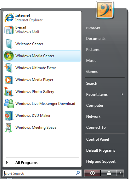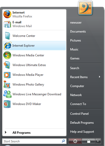 For a new user, whether because Windows is newly installed or because the user is first logging on to a newly created account, the Start Menu typically already shows both pinned shortcuts and most frequently used shortcuts even though no shortcuts have yet been used. The picture above shows such a list for a new user of Windows Vista Ultimate.